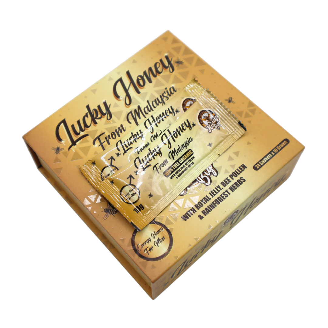 LUCKY HONEY est un stimulant et un fortifiant naturel à base de pollen de palmier dattier, d’un mélange d’herbes de la forêt tropicale malaisienne et de gelée royale.